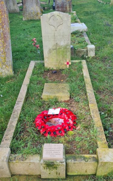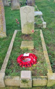 Grave Description: Surrounding plain kerbstones with corner posts at eastern end. Integral flower holder in kerb at eastern end. Upright headstone at western end, in the style of a Commonwealth War Grave with regimental emblem & cross engraved. Square flat white tablet in top central part of grave
